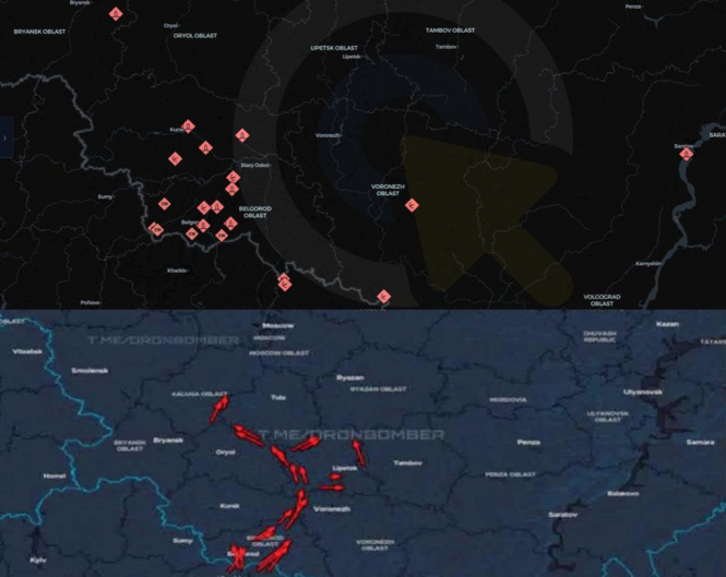 Вгорі – засоби ППО, які були знищені в Бєлгородській області за останні десять місяців. Унизу – прорив не лише спричинив масштабне знищення інфраструктури в Бєлгороді, а й відкрив “коридор” до цілей за межами області, що видно на цій атаці 6 березня.