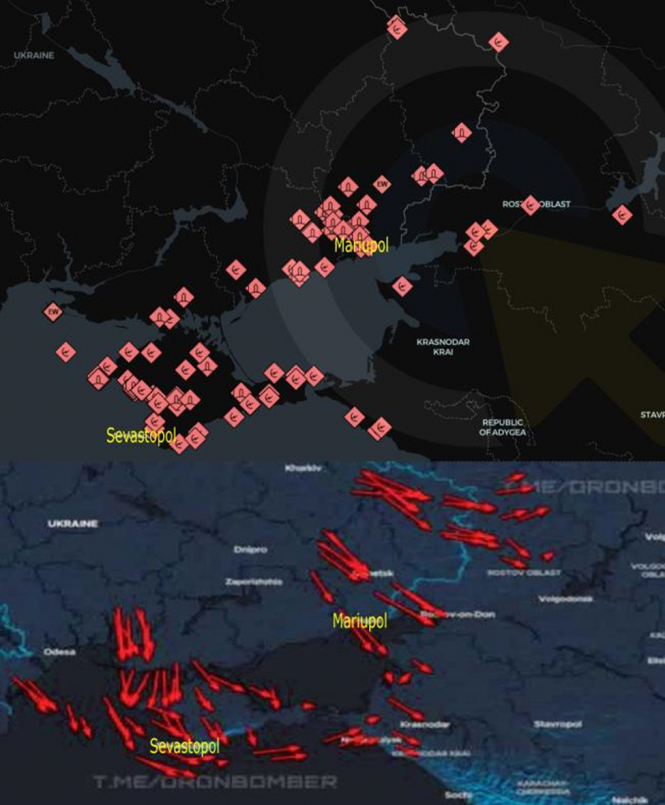 Це та сама атака 6 березня, але ці коридори проходять через Крим, Маріуполь і на північний схід від Маріуполя, хоча в цій місцевості публічно зафіксовано небагато втрат ППО. Можливо, тамтешню ППО також уже розгромлено, або її там небагато, або ж Україна намагається перевантажити її масованістю.